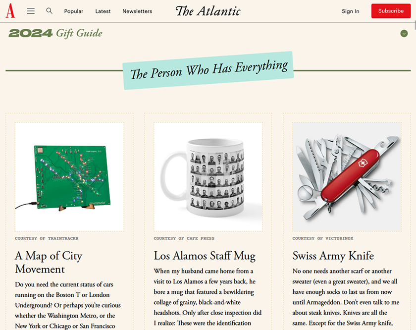 I partnered with the editorial and business teams at The Atlantic to create designs for a new product: The 2024 Gift Guide. The design showcased a wide range of products flexibly while maintaining the high-end look and feel readers expect. The interaction is subtle but playful, utilizing colors and sensibilities based off of the product photography.