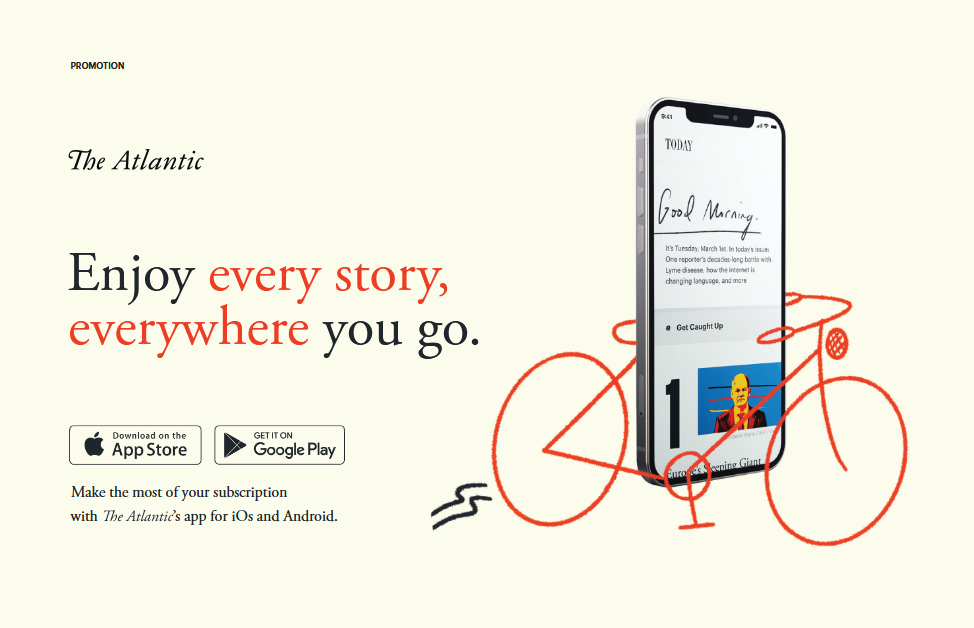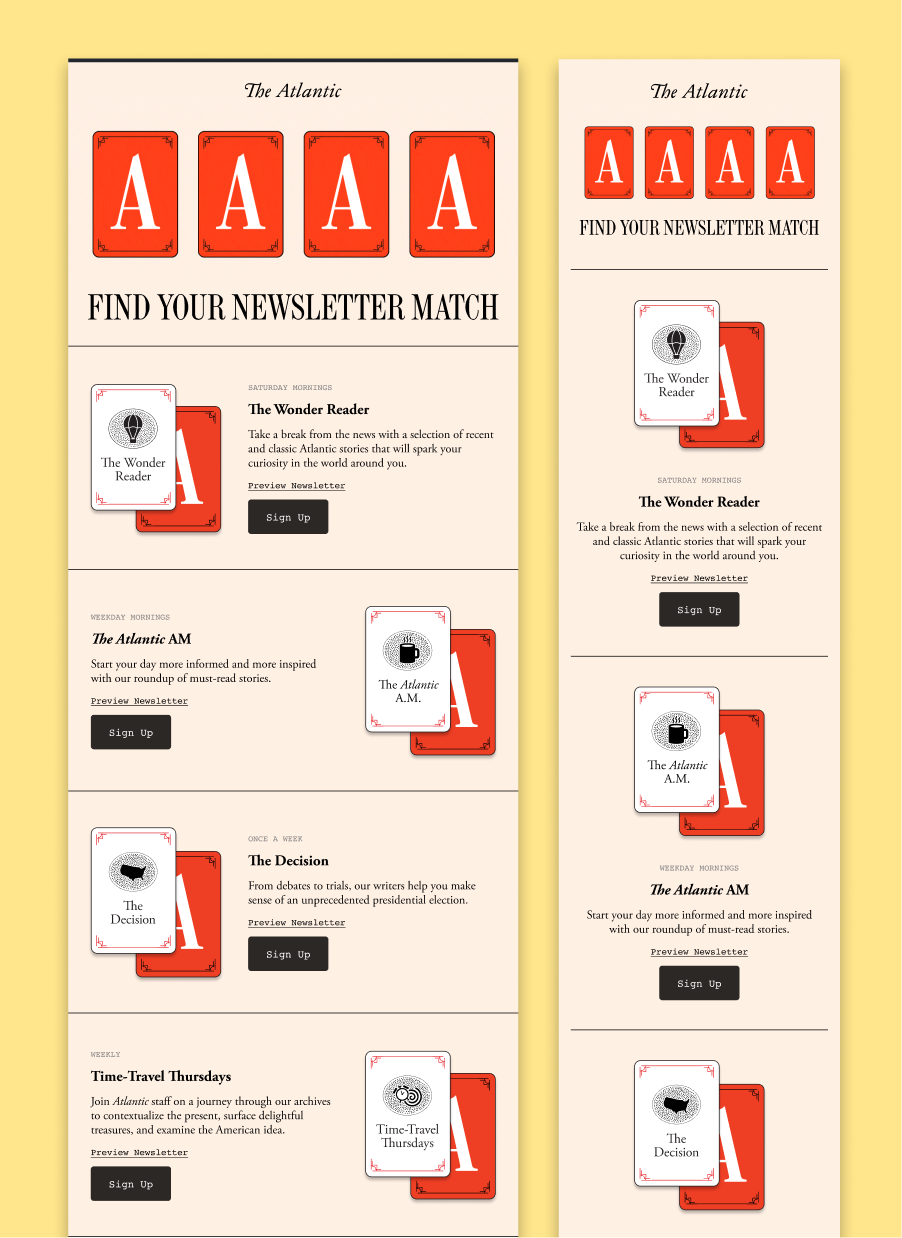 While working as a Product Designer at The Atlantic I frequently helped out their brand and marketing teams to make campaigns and ads come to life. While working as a Product Designer at The Atlantic, I worked closely with the brand and marketing teams to make campaigns and ads come to life. Some of my favorite projects were innovative designs to promote newsletters and The Atlantic app. I also designed the logo and visual design system for the Latino ERG, Atlantic Juntos.