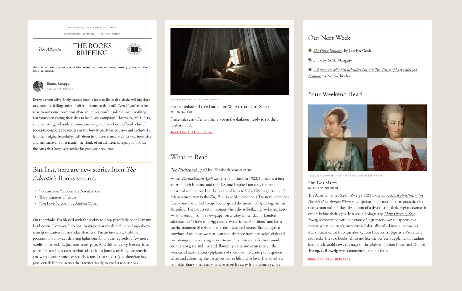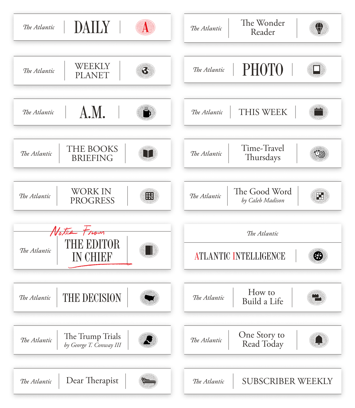 The Atlantic had a robust newsletter ecosystem that featured topics such as climate, relationships, technology, books, photos, and The Atlantic archive. Each newsletter had individual branding that fit in with the broader brand system, maintaining consistency and familiarity for readers. I designed many of the emblem marks shown in headers.